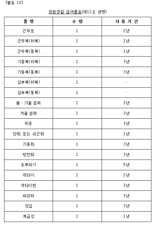 ▲ 청원경찰 급여품표