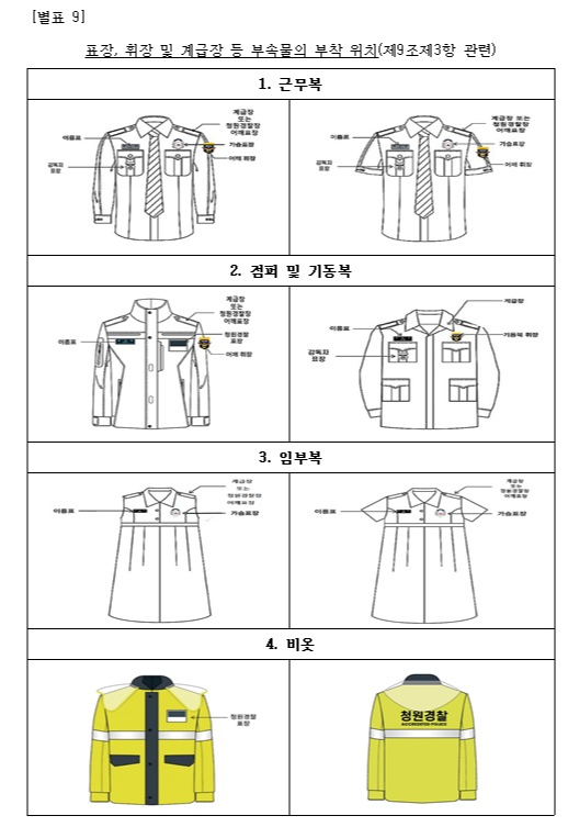 변경된 표장과 계급장을 어디에 달아야 할까요? 개정된 시행규칙은 근무복, 점퍼, 기동복, 임부복, 비옷 등 복장별로 정확한 부착 위치를 명시하고 있습니다.