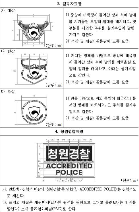 근무복과 기동복에 부착하는 휘장과 계급장 또한 세련된 디자인으로 변경되었습니다. 특히 어깨 휘장은 소속 기관의 명칭을 명확히 표시할 수 있도록 개선되었습니다